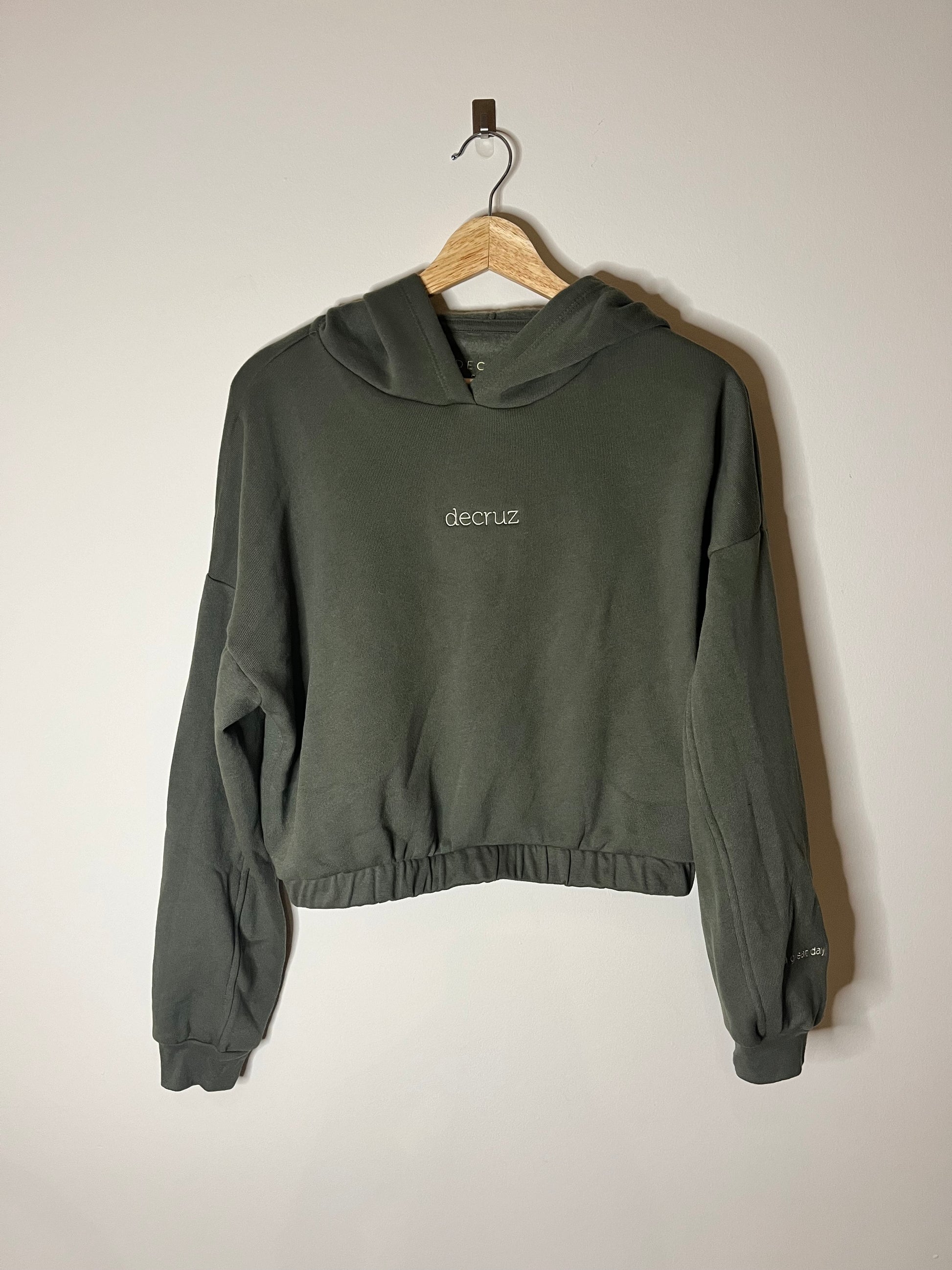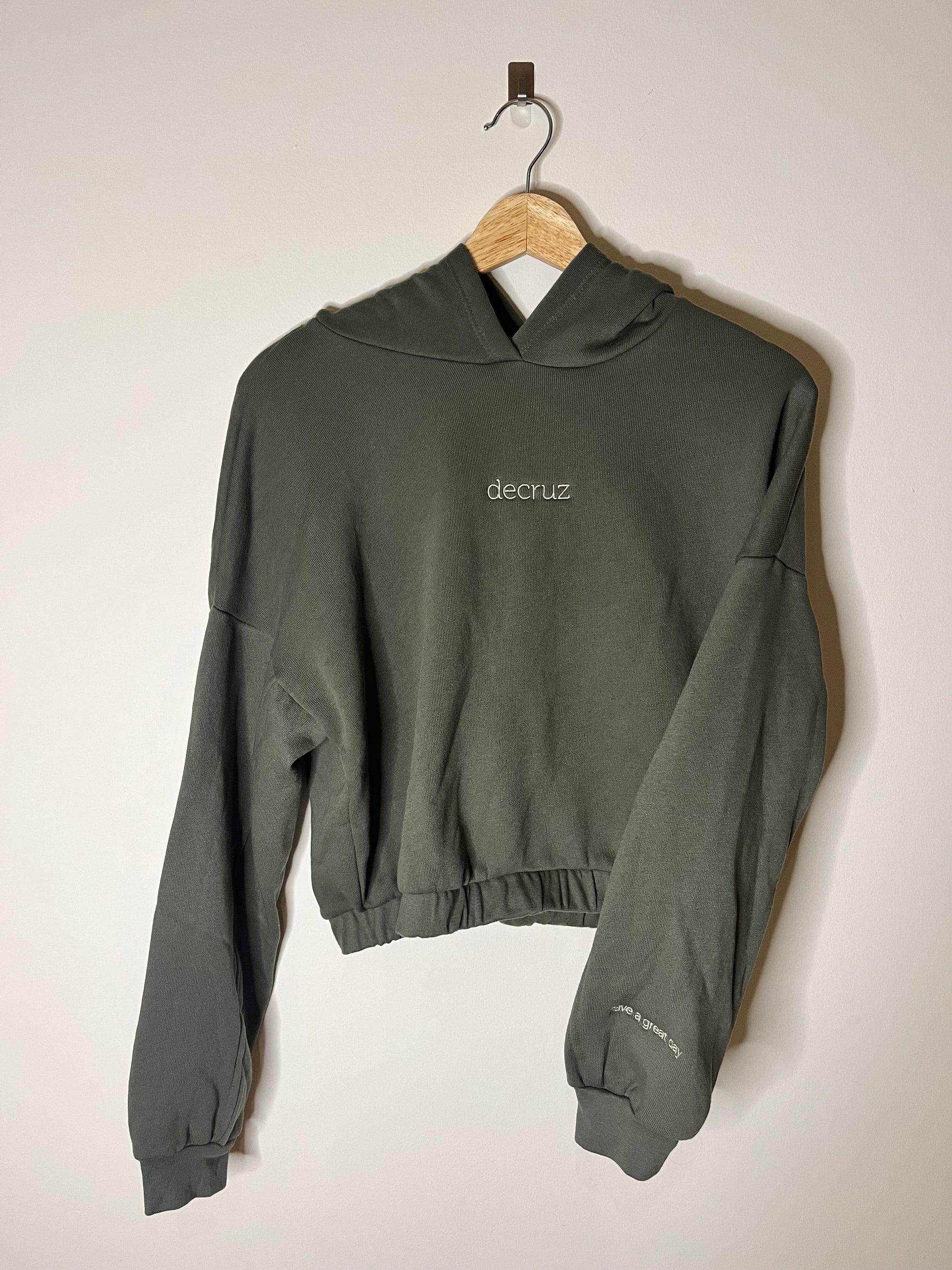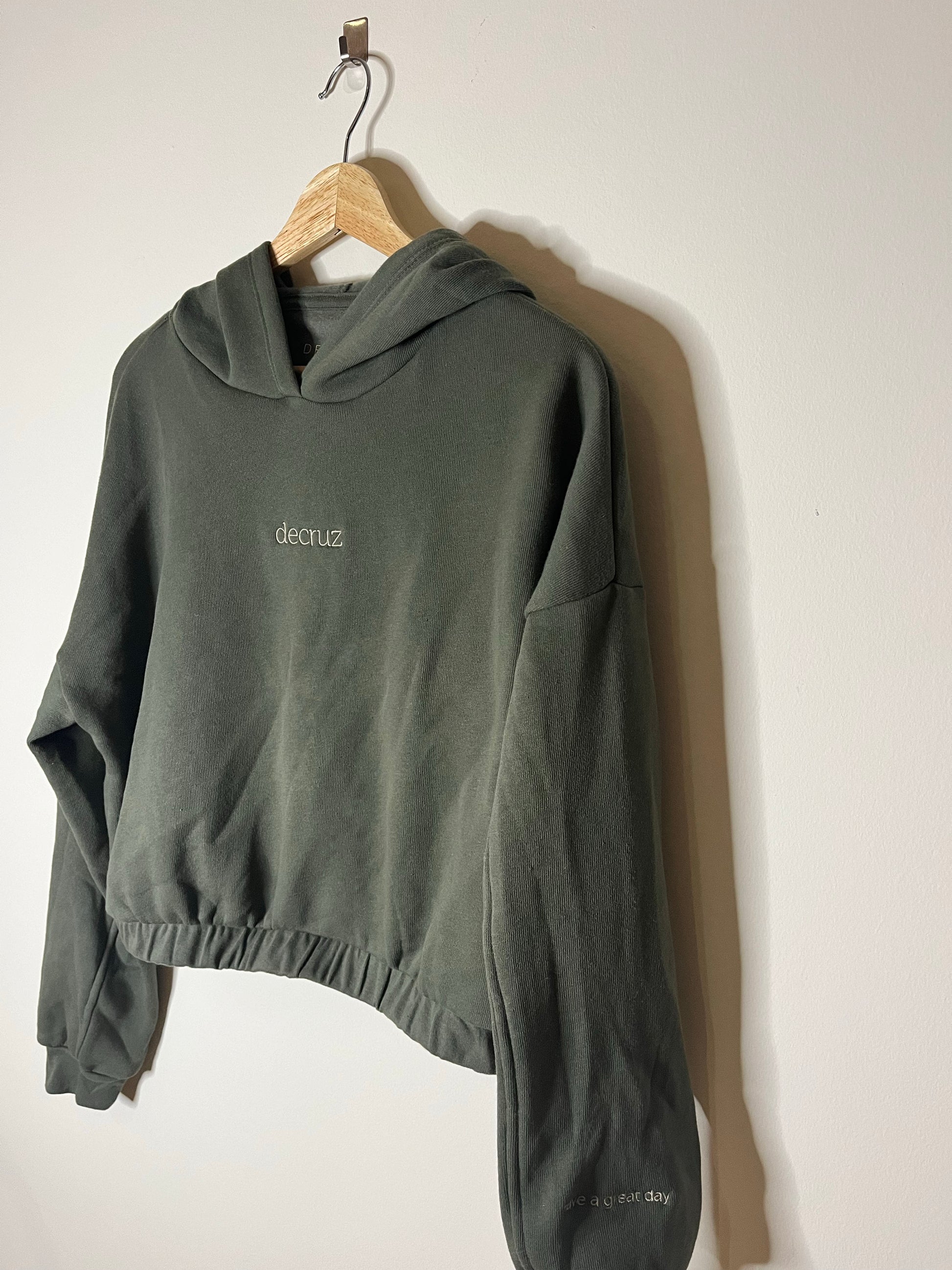 The ultimate mid-length hoodie. Made with the softest Airlume cotton, this hoodie feels like a warm hug with every wear. A cinched elastic hem and mid-length fit with seamed detailing add the perfect touch to this classic piece. A warm up essential, and perfect for on the go. Embroidered text on the left wrist “Have a Great Day” sending every bit of love to you, every day.